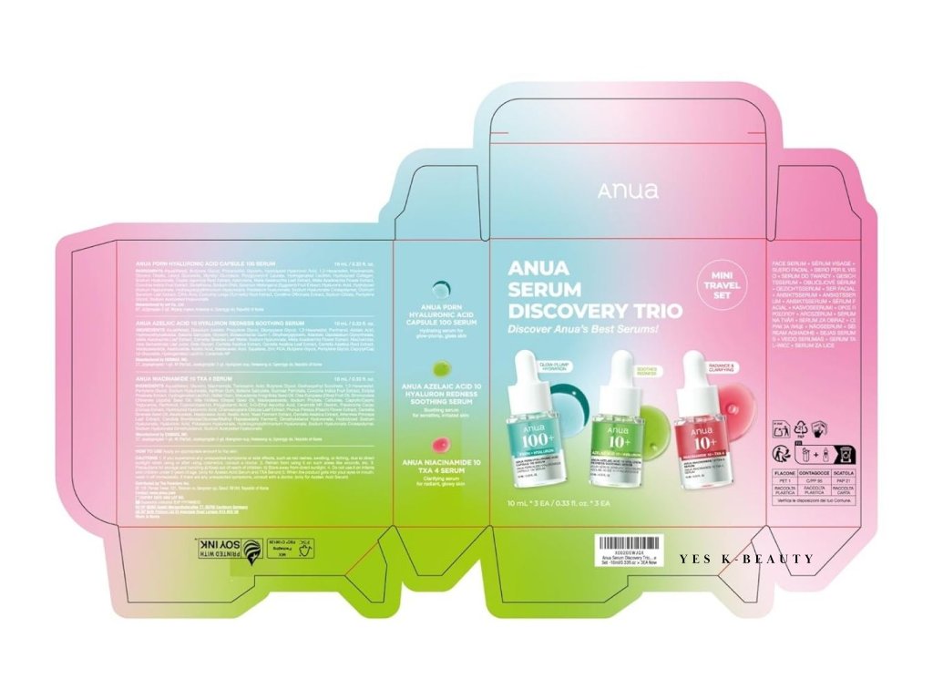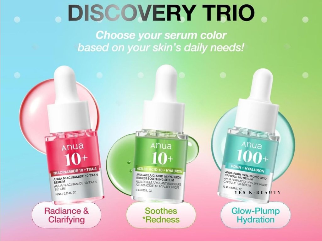 ANUA Serum Mini Trio Set (3×10 ml) spája tri ikonické séra v praktickom mini balení. Ideálne pre cestovanie alebo testovanie účinkov. Každé sérum je zamerané na inú potrebu pleti — hydratáciu, rozjasnenie a upokojenie.