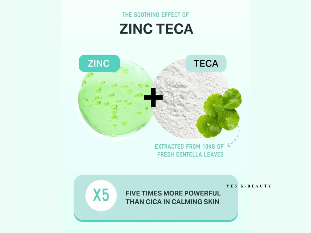 • obsahuje zložky Zinc Teca™, ako je Zinc PCA, Asiaticoside, kyselina madecassová a niacínamid, ktoré pomáhajú znižovať vylučovanie kožného mazu, upokojujú a rozjasňujú pleť a posilňujú kožnú bariéru
