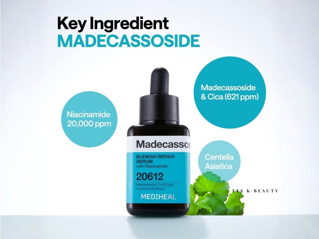 Mediheal Madecassoside Blemish Repair Serum je ľahké, rýchlo vstrebateľné sérum navrhnuté na upokojenie podráždenej pleti a zlepšenie jej celkového vzhľadu. Obsahuje Madecassoside – aktívnu zložku získanú z Centella Asiatica, ktorá je známa svojimi regeneračnými a protizápalovými účinkami.